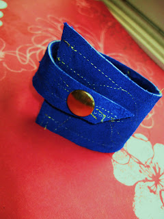 I found a tutorial to make a funky cuff on CraftStylish. The original was made using denim and t shirt fabric, but you know me by now...that just wouldn't do! Back to my suede stash I went! I cut, I stitched, I hammered and came up with these two cuffs